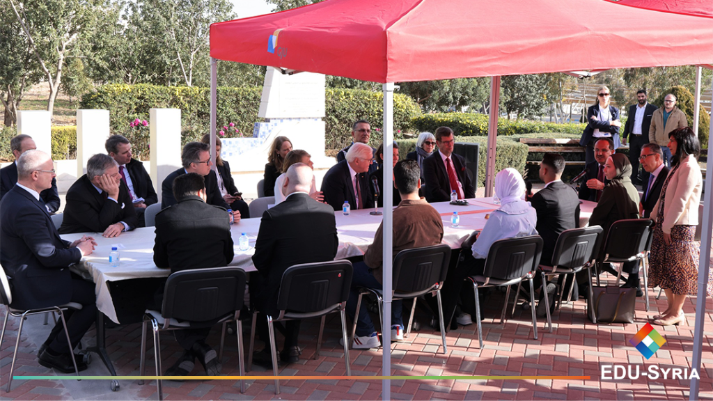 وكان من أبرز محطات الزيارة نقاش تفاعلي ثري جمع فخامة الرئيس شتاينماير بمجموعة من طلبة وخريجي EDU-SYRIA، حيث شارك الطلبة تجاربهم الشخصية في البرنامج، وتحدثوا عن التحديات التي تجاوزوها، وإنجازاتهم الأكاديمية والشخصية، وتطلعاتهم للمستقبل. وقد عكست هذه الجلسة قصص نجاح ملهمة وأكدت الدور التحويلي للتعليم في إعادة بناء الحياة وخلق فرص جديدة.